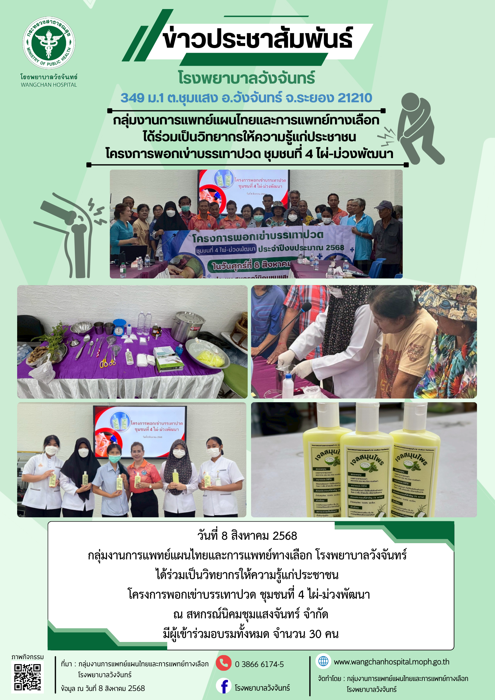 ข่าวประชาสัมพันธ์ กลุ่มงานการแพพย์แผนไทยฯ โรงพยาบาลวังจันทร์ ได้ร่วมเป็นวิทยากรให้ความรู้แก่ประชาชน โครงการพอกเข่าบรรเทาปวด ชุมชนที่ 4 ไผ่-ม่วงพัฒนา ณ สหกรณ์นิคมชุมแสงจันทร์ จำกัด